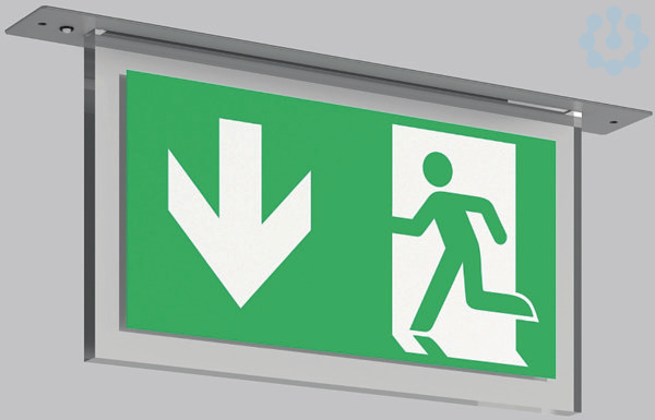 Leuchte zur Rettungswegkennzeichnung. Einbaugehäuse Stahlblech. Deckenplatte Edelstahl glänzend oder pulverbeschichtet. Displayscheibe Kunststoff hochtransparent mit Rettungszeichen einseitig/zweiseitig. Betriebsgeräte integriert. Einzelbatteriesystem mit automatischem Selbsttest. Symbolnummer für Rettungszeichen bei Bestellung angeben!