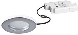 LED-Einbaudownlightset, IP65, Phasenabschnitt dimmbar, chrom, rund. Ausgeführt in kompakter Bauform für werkzeuglose Schnellmontage zum Deckeneinbau. Set inkl. Konverter für 230 V-Netzspannung, Phasenabschnitt dimmbar, Maße Konverter: L 110 x B 50 x H 19 mm Ausführung: ohne Fassung, Montageart: Einbaumontage, Montageort: Deckenmontage, Material: Guss / Aluminium / Glas / Kunststoff, Schutzart raumseitig: nach DIN EN 60529: IP65, Schutzklasse: (EN 61140) II, Spannung: 230V AC 50Hz, Leistung: 6 W, Anzahl der Leuchtmittel / Fassungen: 1 Stück, Lichtstrom: 540 lm, Farbtemperatur: 3.000 K, Abstrahlwinkel: 38°, Verstellbarkeit: nicht verstellbar, Mit Betriebsgerät: Ja, Dimmbar: Ja, Art der Dimmung: Phasenabschnitt.