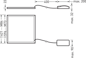 Quadratische LED-Einbauleuchte mit transluzenter Abdeckscheibe DW. Ausführung M84 (625 mm x 625 mm). Optional kann die Leuchte mit einem Notlichtsystem für den Deckeneinbau mit einer Notlichtbetriebsdauer von 3 Stunden ausgestattet werden. In der Betriebsart Notlicht beträgt der Leuchtenlichtstrom 575 lm. Erzeugung einer tieferen Raumwirkung. Geeignet zur Anwendung in HACCP, IFS und/oder BRC Global Standard Food zertifizierten Unternehmen (DIN 10500). Für Systemdecken mit sichtbaren Tragschienen. Der Leuchtenkörper schließt mit dem Deckensystem raumseitung bündig ab. In Kombination mit separat zu bestellenden Zubehören für gesägte Deckenöffnungen sowie zur deckenbündigen Anbaumontage geeignet. Der als Zubehör optional verfügbare Sky-Rahmen bewirkt einen raumatmosphärischen Tiefeneffekt in der klassischen, flachen Moduldecke, die 3-dimensionale Kontur eines Oberlichts wird nachgebildet. Das optische System besteht aus einer transluzenten, vergilbungsfreien PMMA-Abdeckung mit hohem Transmissionsgrad. Die Oberfläche der Abdeckung ist glatt und frei von sichtbaren, microprismatischen Strukturen. Mit tief-breit strahlender Lichtstärkeverteilung. Blendungsbewertung nach UGR-Einstufung (EN 12464-1) < 19. Bildschirmgerecht gemäß EN 12464-1 durch begrenzte Leuchtdichten L ≤ 3000 cd/m2 für Ausstrahlungswinkel oberhalb 65° rundum. Harmonische Lichtwirkung durch gleichmäßig ausgeleuchteten Lichtaustritt. Individuelle Gestaltung der Lichtaustrittsfläche (z.B. durch Druck) und weitere Sonderlösungen auf Anfrage möglich. Bemessungsleistung 31,00 W, Bemessungsleistung 31,00 W, Leuchten-Lichtausbeute 135 lm/W. Lichtfarbe neutralweiß, ähnlichste Farbtemperatur (CCT) 4000 K, allgemeiner Farbwiedergabeindex (CRI) Ra > 80. Mittlere Bemessungslebensdauer L80(tq 25 °C) = 100.000 h, mittlere Bemessungslebensdauer L90(tq 25 °C) = 50.000 h. Die Lichtquelle ist entsprechend der Ökodesign-Anforderungen (VO (EU) 2019/2020) austauschbar. Leuchtenkörper aus Aluminium-Strangpressprofil. Rahmen weiß pulverbeschichtet (RAL 9016). Leuchtenmaße (L x B x H): 621 mm, 621 mm, 22 mm. Das schmale Flankenprofil schließt bündig mit der Tragschiene ab. Zur Erzeugung eines Tiefeneffektes in der Decke ist der Leuchtenrahmen 3-dimensional profiliert. Leuchte mit Dämmmaterial bei ta 25°C abdeckbar, ta35 °C ohne Dämmmaterial ebenfalls nutzbar. Schutzklasse (EN 61140): II, Schutzart (DIN EN 60529): IP20, Schutzart raumseitig: IP40, Stoßfestigkeitsgrad nach IEC 62262: IK03, Prüftemperatur Glühdrahttest gemäß IEC 60695-2-11: 650 °C. Gewicht: 3,5 kg. Verpolungssicher Schnellanschluss mit Netzweiterleitung bis Ø 2,5 mm2. Anschluss des Vorschaltgerätes an Leuchte mittels Steckverbindung (Plug and Play). Das Verpackungskonzept der Leuchte ermöglicht die separate Entnahme des Betriebsgeräts zur Vormontage, die weiteren Bestandteile der Leuchte bleiben bis zur Endmontage geschützt. Mit externem Betriebsgerät, digital dimmbar (DALI). Betriebsgerät gemäß DALI-2-Standard (EN 62386). Leuchte mittels Tastfunktion über DALI-Steuerklemmen schalt- und dimmbar (Touch DIM). Das Betriebsgerät ist entsprechend der Ökodesign-Anforderungen (VO (EU) 2019/2020) austauschbar. Betriebsgerät leerlauffest und vor Fehlanschluss, Kurzschluss, Überlastung und Übertemperatur geschützt. Output Ripple des Betriebsgerätes ≤ 4 % zur effektiven Ansteuerung des LED-Systems und flickerfreiem Licht. Die Leuchte kann auf Anfrage mit der Funktionalität Monitoring ready (MOR) ausgestattet werden. Das Produkt erfüllt die grundlegenden Anforderungen der anwendbaren EU-Richtlinien und des Produktsicherheitsgesetzes und trägt die CE-Kennzeichnung. Zusätzlich ist die Leuchte durch eine unabhängige Prüfstelle ENEC-zertifiziert. Die Leuchte ist Bestandteil eines Sortiments von Einbau-, Anbau- und Hängeleuchten, die im Erscheinungsbild aufeinander abgestimmt sind. Die Anwendungsvielfalt der Produktreihe wird durch Varianten im Bereich der Lichtstrompakete, Lichtverteilungskurven und Schutzarten zusätzlich unterstrichen. Auf Anfrage kann das Basis-Sortiment um projektspezifische Leuchten-Merkmale erweitert werden.