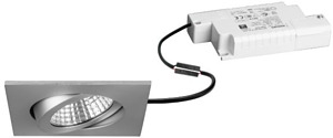 LED-Einbaustrahlerset, IP65, Phasenabschnitt dimmbar, alu matt, quadratisch. Ausgeführt in kompakter Bauform für werkzeuglose Schnellmontage zum Deckeneinbau. Set inkl. Konverter für 230 V-Netzspannung, Phasenabschnitt dimmbar, Maße Konverter: L 110 x B 50 x H 19 mm Ausführung: ohne Fassung, Montageart: Einbaumontage, Montageort: Deckenmontage, Material: Aluminium / Stahl / Silikonkautschuk / Polycarbonat, Schutzart raumseitig: nach DIN EN 60529: IP65, Schutzklasse: (EN 61140) II, Spannung: 230V AC 50Hz, Leistung: 6 W, Anzahl der Leuchtmittel / Fassungen: 1 Stück, Lichtstrom: 650 lm, Farbtemperatur: 3.000 K, Abstrahlwinkel: 38°, Verstellbarkeit: schwenkbar, Mit Betriebsgerät: Ja, Dimmbar: Ja, Art der Dimmung: Phasenabschnitt.