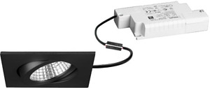 LED-Einbaustrahlerset, IP65, Phasenabschnitt dimmbar, schwarz, quadratisch. Ausgeführt in kompakter Bauform für werkzeuglose Schnellmontage zum Deckeneinbau. Set inkl. Konverter für 230 V-Netzspannung, Phasenabschnitt dimmbar, Maße Konverter: L 110 x B 50 x H 19 mm Ausführung: ohne Fassung, Montageart: Einbaumontage, Montageort: Deckenmontage, Material: Aluminium / Stahl / Silikonkautschuk / Polycarbonat, Schutzart raumseitig: nach DIN EN 60529: IP65, Schutzklasse: (EN 61140) II, Spannung: 230V AC 50Hz, Leistung: 6 W, Anzahl der Leuchtmittel / Fassungen: 1 Stück, Lichtstrom: 650 lm, Farbtemperatur: 3.000 K, Abstrahlwinkel: 38°, Verstellbarkeit: schwenkbar, Mit Betriebsgerät: Ja, Dimmbar: Ja, Art der Dimmung: Phasenabschnitt.