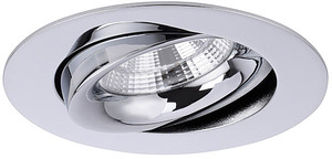 LED-Einbau. 350mA 5W 3000K rund chrom LED-Einbaustrahler rund, schwenkbar 25°, bestückt mit 1 x Hochleistungs-LED für den Einsatz im Bereich der Allgemein- oder Akzentbeleuchtung, Montage in Hohldecken mit Federbefestigung, mit BRUMBERG-Steckverbindung 350 mA (Plug & Play, Reihenschaltung), LED Lichtquelle nach unten abstrahlend, mit Aluminium-Facetten-Reflektor, Abstrahlwinkel 36°. Einbauleuchte geeignet zur direkten Montage auf normal entflammbaren, Baustoffen. Wärmedämmung zulässig. Energieeffizienzklasse A++ bis A. Diese Leuchte enthält eingebaute LED-Lampen. Diese Lampen können in der Leuchte nicht ausgetauscht werden.