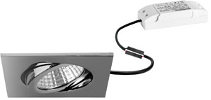 LED-Einbaustrahlerset, IP65, schaltbar, chrom, quadratisch. Ausgeführt in kompakter Bauform für werkzeuglose Schnellmontage zum Deckeneinbau. Set inkl. Konverter für 230 V-Netzspannung, schaltbar, Maße Konverter: L 71 x B 36 x H 22 mm Montageart: Einbaumontage, Montageort: Deckenmontage, Material: Aluminium / Stahl / Silikonkautschuk / Polycarbonat, Schutzart raumseitig: nach DIN EN 60529: IP65, Schutzklasse: (EN 61140) II, Spannung: 230V AC 50Hz, Leistung: 6 W, Anzahl der Leuchtmittel / Fassungen: 1 Stück, Lichtstrom: 650 lm, Farbtemperatur: 3.000 K, Abstrahlwinkel: 38°, Verstellbarkeit: schwenkbar, Mit Betriebsgerät: Ja, Dimmbar: Nein, Art der Dimmung: schaltbar.