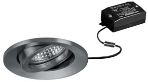 LED-Einbaustrahlerset, schaltbar, nickel matt, rund. Ausgeführt in kompakter Bauform für werkzeuglose Schnellmontage zum Deckeneinbau. Set inkl. Konverter für 230 V-Netzspannung, schaltbar, Maße Konverter: L 68 x B 35 x H 21 mm Ausführung: ohne Fassung, Montageart: Einbaumontage, Montageort: Deckenmontage, Material: Aluminiumguss / Aluminium / Glas / Kunststoff, Schutzart raumseitig: nach DIN EN 60529: IP20, Schutzklasse: (EN 61140) II, Spannung: 230V AC 50Hz, Leistung: 6 W, Anzahl der Leuchtmittel / Fassungen: 1 Stück, Lichtstrom: 680 lm, Farbtemperatur: 3.000 K, Abstrahlwinkel: 38°, Verstellbarkeit: schwenkbar, Mit Betriebsgerät: Ja, Dimmbar: Nein, Art der Dimmung: schaltbar.