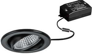 LED-Einbaustrahlerset, schaltbar, schwarz, rund. Ausgeführt in kompakter Bauform für werkzeuglose Schnellmontage zum Deckeneinbau. Set inkl. Konverter für 230 V-Netzspannung, schaltbar, Maße Konverter: L 68 x B 35 x H 21 mm Ausführung: ohne Fassung, Montageart: Einbaumontage, Montageort: Deckenmontage, Material: Stahl / Messing / Aluminium / Glas / Kunststoff, Schutzart raumseitig: nach DIN EN 60529: IP20, Schutzklasse: (EN 61140) II, Spannung: 230V AC 50Hz, Leistung: 6 W, Anzahl der Leuchtmittel / Fassungen: 1 Stück, Lichtstrom: 680 lm, Farbtemperatur: 3.000 K, Abstrahlwinkel: 38°, Verstellbarkeit: schwenkbar, Mit Betriebsgerät: Ja, Dimmbar: Nein, Art der Dimmung: schaltbar.