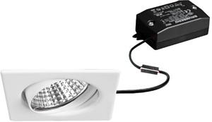 LED-Einbaustrahlerset, schaltbar, weiß, quadratisch. Ausgeführt in kompakter Bauform für werkzeuglose Schnellmontage zum Deckeneinbau. Set inkl. Konverter für 230 V-Netzspannung, schaltbar, Maße Konverter: L 68 x B 35 x H 21 mm. Ausführung: ohne Fassung, Montageart: Einbaumontage, Montageort: Deckenmontage, Material: Stahl / Aluminium / Glas / Kunststoff, Schutzart raumseitig: nach DIN EN 60529: IP20, Schutzklasse: (EN 61140) II, Spannung: 230V AC 50Hz, Leistung: 6 W, Anzahl der Leuchtmittel / Fassungen: 1 Stück, Lichtstrom: 680 lm, Farbtemperatur: 3.000 K, Abstrahlwinkel: 38°, Verstellbarkeit: schwenkbar, Mit Betriebsgerät: Ja, Dimmbar: Nein, Art der Dimmung: schaltbar.