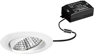 LED-Einbaustrahlerset, schaltbar, weiß, rund. Ausgeführt in kompakter Bauform für werkzeuglose Schnellmontage zum Deckeneinbau. Set inkl. Konverter für 230 V-Netzspannung, schaltbar, Maße Konverter: L 68 x B 35 x H 21 mm Ausführung: ohne Fassung, Montageart: Einbaumontage, Montageort: Deckenmontage, Material: Stahl / Aluminium / Glas / Kunststoff, Schutzart raumseitig: nach DIN EN 60529: IP20, Schutzklasse: (EN 61140) II, Spannung: 230V AC 50Hz, Leistung: 6 W, Anzahl der Leuchtmittel / Fassungen: 1 Stück, Lichtstrom: 680 lm, Farbtemperatur: 3.000 K, Abstrahlwinkel: 38°, Verstellbarkeit: schwenkbar, Mit Betriebsgerät: Ja, Dimmbar: Nein, Art der Dimmung: schaltbar.