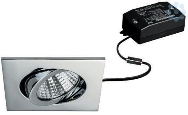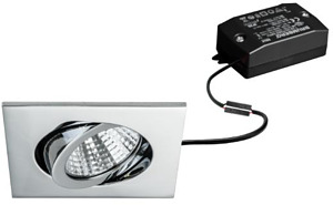 LED-Einbaustrahlerset, schaltbar, chrom, quadratisch. Ausgeführt in kompakter Bauform für werkzeuglose Schnellmontage zum Deckeneinbau. Set inkl. Konverter für 230 V-Netzspannung, schaltbar, Maße Konverter: L 68 x B 35 x H 21 mm Montageart: Einbaumontage, Montageort: Deckenmontage, Material: Aluminium / Polycarbonat, Schutzart raumseitig: nach DIN EN 60529: IP20, Schutzklasse: (EN 61140) II, Spannung: 230V AC 50Hz, Leistung: 7 W, Anzahl der Leuchtmittel / Fassungen: 1 Stück, Lichtstrom: 740 lm, Farbtemperatur: 3.000 K, Abstrahlwinkel: 38°, Verstellbarkeit: schwenkbar, Mit Betriebsgerät: Ja, Dimmbar: Nein, Art der Dimmung: schaltbar.