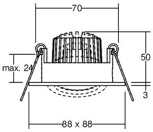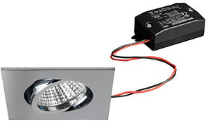 LED-Einbaustrahlerset, schaltbar, chrom, quadratisch. Ausgeführt in kompakter Bauform für werkzeuglose Schnellmontage zum Deckeneinbau. Set inkl. Konverter für 230 V-Netzspannung, schaltbar, Maße Konverter: L 68 x B 35 x H 21 mm. Montageart: Einbaumontage, Montageort: Deckenmontage, Material: Aluminiumguss / Aluminium / Glas, Schutzart: nach DIN EN 60529: IP20, Schutzklasse: (EN 61140) II, Spannung: 230V AC 50Hz, Leistung: 6W, Anzahl der Leuchtmittel / Fassungen: 1.0 Stk, Lichtstrom: 680lm, Farbtemperatur: 3000 K, Lichtfarbe: weiß, Abstrahlwinkel: 38°, Verstellbarkeit: drehbar und schwenkbar, mit Betriebsgerät, Art der Dimmung: schaltbar.