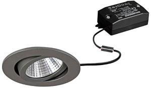 LED-Einbaustrahlerset, schaltbar, titan matt, rund. Ausgeführt in kompakter Bauform für werkzeuglose Schnellmontage zum Deckeneinbau. Set inkl. Konverter für 230 V-Netzspannung, schaltbar, Maße Konverter: L 68 x B 35 x H 21 mm Montageart: Einbaumontage, Montageort: Deckenmontage, Material: Aluminium / Polycarbonat, Schutzart raumseitig: nach DIN EN 60529: IP20, Schutzklasse: (EN 61140) II, Spannung: 230V AC 50Hz, Leistung: 7 W, Anzahl der Leuchtmittel / Fassungen: 1 Stück, Lichtstrom: 740 lm, Farbtemperatur: 3.000 K, Abstrahlwinkel: 38°, Verstellbarkeit: schwenkbar, Mit Betriebsgerät: Ja, Dimmbar: Nein, Art der Dimmung: schaltbar.