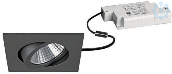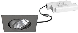 LED-Einbaustrahlerset, Phasenabschnitt dimmbar, titan matt, quadratisch. Ausgeführt in kompakter Bauform für werkzeuglose Schnellmontage zum Deckeneinbau. Set inkl. Konverter für 230 V-Netzspannung, Phasenabschnitt, Maße Konverter: L 110 x B 50 x H 19 mm Ausführung: ohne Fassung, Montageart: Einbaumontage, Montageort: Deckenmontage, Material: Aluminium / Polycarbonat, Schutzart raumseitig: nach DIN EN 60529: IP20, Schutzklasse: (EN 61140) II, Spannung: 230V AC 50Hz, Leistung: 7 W, Anzahl der Leuchtmittel / Fassungen: 1 Stück, Lichtstrom: 740 lm, Farbtemperatur: 3.000 K, Abstrahlwinkel: 38°, Verstellbarkeit: schwenkbar, Mit Betriebsgerät: Ja, Dimmbar: Ja, Art der Dimmung: Phasenabschnitt.