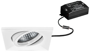 LED-Einbaustrahlerset, schaltbar, weiß, quadratisch. Ausgeführt in kompakter Bauform für werkzeuglose Schnellmontage zum Deckeneinbau. Set inkl. Konverter für 230 V-Netzspannung, schaltbar, Maße Konverter: L 68 x B 35 x H 21 mm Ausführung: ohne Fassung, Montageart: Einbaumontage, Montageort: Deckenmontage, Material: Aluminiumguss / Aluminium / Glas / Kunststoff, Schutzart raumseitig: nach DIN EN 60529: IP20, Schutzklasse: (EN 61140) II, Spannung: 230V AC 50Hz, Leistung: 6 W, Anzahl der Leuchtmittel / Fassungen: 1 Stück, Lichtstrom: 680 lm, Farbtemperatur: 3.000 K, Abstrahlwinkel: 38°, Verstellbarkeit: schwenkbar, Mit Betriebsgerät: Ja, Dimmbar: Nein, Art der Dimmung: schaltbar.