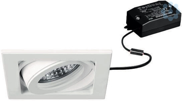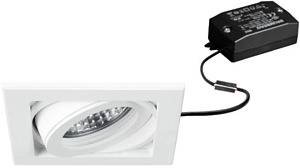 LED-Einbaustrahlerset, kardanisch, schaltbar, strukturweiß, quadratisch. Ausgeführt in kompakter Bauform für werkzeuglose Schnellmontage zum Deckeneinbau. Set inkl. Konverter für 230 V-Netzspannung, schaltbar, Maße Konverter: L 68 x B 35 x H 21 mm Ausführung: ohne Fassung, Montageart: Einbaumontage, Montageort: Deckenmontage, Material: Aluminium / Glas / Kunststoff, Schutzart raumseitig: nach DIN EN 60529: IP20, Schutzklasse: (EN 61140) II, Spannung: 230V AC 50Hz, Leistung: 6 W, Anzahl der Leuchtmittel / Fassungen: 1 Stück, Lichtstrom: 680 lm, Farbtemperatur: 3.000 K, Abstrahlwinkel: 38°, Verstellbarkeit: drehbar und schwenkbar, Mit Betriebsgerät: Ja, Dimmbar: Nein, Art der Dimmung: schaltbar.