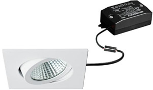 LED-Einbaustrahlerset, schaltbar, weiß, quadratisch. Ausgeführt in kompakter Bauform für werkzeuglose Schnellmontage zum Deckeneinbau. Set inkl. Konverter für 230 V-Netzspannung, schaltbar, Maße Konverter: L 68 x B 35 x H 21 mm Montageart: Einbaumontage, Montageort: Deckenmontage, Material: Aluminium / Polycarbonat, Schutzart raumseitig: nach DIN EN 60529: IP20, Schutzklasse: (EN 61140) II, Spannung: 230V AC 50Hz, Leistung: 7 W, Anzahl der Leuchtmittel / Fassungen: 1 Stück, Lichtstrom: 740 lm, Farbtemperatur: 3.000 K, Abstrahlwinkel: 38°, Verstellbarkeit: schwenkbar, Mit Betriebsgerät: Ja, Dimmbar: Nein, Art der Dimmung: schaltbar.