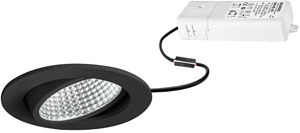 LED-Einbaustrahlerset, Phasenabschnitt dimmbar, schwarz, rund. Ausgeführt in kompakter Bauform für werkzeuglose Schnellmontage zum Deckeneinbau. Set inkl. Konverter für 230 V-Netzspannung, Phasenabschnitt dimmbar, Maße Konverter: L 110,5 x B 52 x H 22 mm Montageart: Einbaumontage, Montageort: Deckenmontage, Material: Aluminium / Glas, Schutzart raumseitig: nach DIN EN 60529: IP20, Schutzklasse: (EN 61140) II, Spannung: 230V AC 50Hz, Leistung: 12 W, Anzahl der Leuchtmittel / Fassungen: 1 Stück, Lichtstrom: 1.280 lm, Farbtemperatur: 4.000 K, Abstrahlwinkel: 38°, Verstellbarkeit: schwenkbar, Mit Betriebsgerät: Ja, Dimmbar: Ja, Art der Dimmung: Phasenabschnitt.
