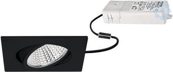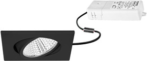 LED-Einbaustrahlerset, Phasenabschnitt dimmbar, schwarz, quadratisch. Ausgeführt in kompakter Bauform für werkzeuglose Schnellmontage zum Deckeneinbau. Set inkl. Konverter für 230 V-Netzspannung, Phasenabschnitt dimmbar, Maße Konverter: L 110,5 x B 52 x H 22 mm Montageart: Einbaumontage, Montageort: Deckenmontage, Material: Aluminium / Glas, Schutzart raumseitig: nach DIN EN 60529: IP20, Schutzklasse: (EN 61140) II, Spannung: 230V AC 50Hz, Leistung: 12 W, Anzahl der Leuchtmittel / Fassungen: 1 Stück, Lichtstrom: 1.230 lm, Farbtemperatur: 3.000 K, Abstrahlwinkel: 38°, Verstellbarkeit: schwenkbar, Mit Betriebsgerät: Ja, Dimmbar: Ja, Art der Dimmung: Phasenabschnitt.