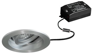 LED-Einbaustrahlerset, schaltbar, alu matt, rund. Ausgeführt in kompakter Bauform für werkzeuglose Schnellmontage zum Deckeneinbau. Set inkl. Konverter für 230 V-Netzspannung, schaltbar, Maße Konverter: L 68 x B 35 x H 21 mm Ausführung: ohne Fassung, Montageart: Einbaumontage, Montageort: Deckenmontage, Material: Aluminium / Glas / Kunststoff, Schutzart raumseitig: nach DIN EN 60529: IP20, Schutzklasse: (EN 61140) II, Spannung: 230V AC 50Hz, Leistung: 6 W, Anzahl der Leuchtmittel / Fassungen: 1 Stück, Lichtstrom: 680 lm, Farbtemperatur: 3.000 K, Abstrahlwinkel: 38°, Verstellbarkeit: schwenkbar, Mit Betriebsgerät: Ja, Dimmbar: Nein, Art der Dimmung: schaltbar.