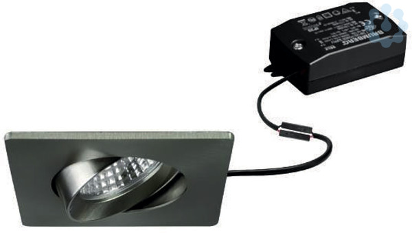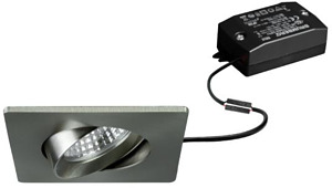 LED-Einbaustrahlerset, schaltbar, nickel matt, quadratisch. Ausgeführt in kompakter Bauform für werkzeuglose Schnellmontage zum Deckeneinbau. Set inkl. Konverter für 230 V-Netzspannung, schaltbar, Maße Konverter: L 68 x B 35 x H 21 mm Ausführung: ohne Fassung, Montageart: Einbaumontage, Montageort: Deckenmontage, Material: Aluminium / Glas / Kunststoff, Schutzart raumseitig: nach DIN EN 60529: IP20, Schutzklasse: (EN 61140) II, Spannung: 230 V, Leistung: 6 W, Anzahl der Leuchtmittel / Fassungen: 1 Stück, Lichtstrom: 680 lm, Farbtemperatur: 3.000 K, Abstrahlwinkel: 38°, Verstellbarkeit: schwenkbar, Mit Betriebsgerät: Ja, Dimmbar: Nein, Art der Dimmung: schaltbar.
