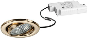 LED-Einbaustrahlerset, Phasenabschnitt dimmbar, gold, rund. Ausgeführt in kompakter Bauform für werkzeuglose Schnellmontage zum Deckeneinbau. Set inkl. Konverter für 230 V-Netzspannung, Phasenabschnitt dimmbar, Maße Konverter: L 110 x B 50 x H 19 mm Ausführung: ohne Fassung, Montageart: Einbaumontage, Montageort: Deckenmontage, Material: Stahl / Messing / Aluminium / Glas / Kunststoff, Schutzart raumseitig: nach DIN EN 60529: IP20, Schutzklasse: (EN 61140) II, Spannung: 230V AC 50Hz, Leistung: 6 W, Anzahl der Leuchtmittel / Fassungen: 1 Stück, Lichtstrom: 680 lm, Farbtemperatur: 3.000 K, Abstrahlwinkel: 38°, Verstellbarkeit: schwenkbar, Mit Betriebsgerät: Ja, Dimmbar: Ja, Art der Dimmung: Phasenabschnitt.