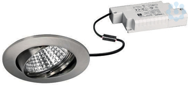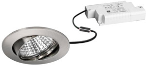 LED-Einbaustrahlerset, Phasenabschnitt dimmbar, chrom matt, rund. Ausgeführt in kompakter Bauform für werkzeuglose Schnellmontage zum Deckeneinbau. Set inkl. Konverter für 230 V-Netzspannung, Phasenabschnitt dimmbar, Maße Konverter: L 68 x B 35 x H 21 mm Ausführung: ohne Fassung, Montageart: Einbaumontage, Montageort: Deckenmontage, Material: Aluminium / Glas / Kunststoff, Schutzart raumseitig: nach DIN EN 60529: IP20, Schutzklasse: (EN 61140) II, Spannung: 230V AC 50Hz, Leistung: 6 W, Anzahl der Leuchtmittel / Fassungen: 1 Stück, Lichtstrom: 680 lm, Farbtemperatur: 3.000 K, Abstrahlwinkel: 38°, Verstellbarkeit: schwenkbar, Mit Betriebsgerät: Ja, Dimmbar: Ja, Art der Dimmung: Phasenabschnitt.