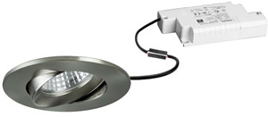 LED-Einbaustrahlerset, Phasenabschnitt dimmbar, nickel matt, rund. Ausgeführt in kompakter Bauform für werkzeuglose Schnellmontage zum Deckeneinbau. Set inkl. Konverter für 230 V-Netzspannung, Phasenabschnitt dimmbar, Maße Konverter: L 110 x B 50 x H 19 mm Montageart: Einbaumontage, Montageort: Deckenmontage, Material: Aluminium / Glas / Kunststoff, Schutzart raumseitig: nach DIN EN 60529: IP20, Schutzklasse: (EN 61140) II, Spannung: 230V, Leistung: 6 W, Anzahl der Leuchtmittel / Fassungen: 1 Stück, Lichtstrom: 680 lm, Farbtemperatur: 3.000 K, Abstrahlwinkel: 38°, Verstellbarkeit: schwenkbar, Mit Betriebsgerät: Ja, Dimmbar: Ja, Art der Dimmung: Phasenabschnitt.