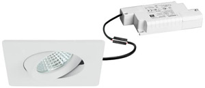 LED-Einbaustrahlerset, Phasenabschnitt dimmbar, weiß. Ausgeführt in kompakter Bauform für werkzeuglose Schnellmontage zum Deckeneinbau. Set inkl. Konverter für 230 V-Netzspannung, Phasenabschnitt dimmbar, Maße Konverter: L 110 x B 50 x H 19 mm Montageart: Einbaumontage, Montageort: Deckenmontage, Material: Aluminium / Glas / Kunststoff, Schutzart raumseitig: nach DIN EN 60529: IP20, Schutzklasse: (EN 61140) II, Spannung: 230 V, Leistung: 6 W, Anzahl der Leuchtmittel / Fassungen: 1 Stück, Lichtstrom: 680 lm, Farbtemperatur: 3.000 K, Abstrahlwinkel: 38°, Verstellbarkeit: schwenkbar, Mit Betriebsgerät: Ja, Dimmbar: Ja, Art der Dimmung: Phasenabschnitt.