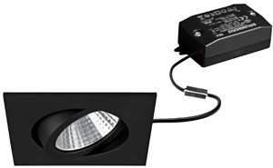LED-Einbaustrahlerset, schaltbar, schwarz, quadratisch. Ausgeführt in kompakter Bauform für werkzeuglose Schnellmontage zum Deckeneinbau. Set inkl. Konverter für 230 V-Netzspannung, schaltbar, Maße Konverter: L 68 x B 35 x H 21 mm Montageart: Einbaumontage, Montageort: Deckenmontage, Material: Aluminium / Polycarbonat, Schutzart raumseitig: nach DIN EN 60529: IP20, Schutzklasse: (EN 61140) II, Spannung: 230V AC 50Hz, Leistung: 7 W, Anzahl der Leuchtmittel / Fassungen: 1 Stück, Lichtstrom: 740 lm, Farbtemperatur: 3.000 K, Abstrahlwinkel: 38°, Verstellbarkeit: schwenkbar, Mit Betriebsgerät: Ja, Dimmbar: Nein, Art der Dimmung: schaltbar.
