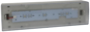 Einzelbatterieleuchte inkl. Abdeckhaube, 3 Piktogrammfolien (Pfeil links, rechts und unten) gem. ISO 7010, Folieneinheit mit Prüftaster und farbigen LEDs zur differenzierten Statusanzeige für den autarken Betrieb oder zum Anschluss an zentrale Überwachungseinrichtung CGLine+. Automatischer Funktionstest (wöchentlich) sowie automatischer Betriebsdauertest (alle 3 Monate). 1 Minute Rückschaltverzögerung nach Netzwiederkehr. Blockierfunktion über zentrale Überwachungseinrichtung für Betriebsruhezeiten. Zulässiger Temperaturbereich: Dauerlicht -5°C bis +30°C / Bereitschaftslicht 0°C bis + 35°C. Montageart: Wandanbau Leuchtmittel: LED Lampenleistung: 6,6 W Werkstoff des Gehäuses: Kunststoff Gehäusefarbe: grau Art der Kennzeichnung: nur einseitig Geeignet für Kennzeichnungsart: Aufkleber Überwachungseinrichtung: automatischer Selbsttest Ballwurfsicher: Nein Schaltungsart: Dauerschaltung/Bereitschaftsschaltung Mit Fernschalteranschluss (VDE 0100-718, VDE 0108-100): Ja Einspeisung: dezentral (Einzelbatterie) Nennspannung: 220 - 240 V Schutzklasse: II Schutzart (IP): IP41 Nennbetriebsdauer: 3 h Mit Leuchtmittel: Ja Länge: 340 mm Breite: 95 mm Höhe/Tiefe: 72 mm Lichtstrom bei Notbetrieb: 70 % Erkennungsweite: 17 m