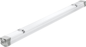 LED Profilleuchte mit integriertem LED-Konverter. Geeignet für Wand- und Deckenmontage. Zugelassen für den Einsatz in Innen- und geschützten Außenbereichen. Schnellmontage mit Deckenklammer aus Edelstahl (Leuchte einclipsbar), ausrichten der Leuchte durch den variablen Verschiebebereich ±100mm. Profil aus schlagfestem Polycarbonat (PC) in lichtsteuernder opalisierter Optik. Endkappen aus schlagfestem Polycarbonat (PC) grau. Deckenaufhellung mit hohem Indirektanteil von 16 %. Geräteträger aus Stahlblech verzinkt in weiß. Leuchte mit begrenzter Oberflächentemperatur, für Bereiche, in denen leitfähige Stäube zu erwarten sind.