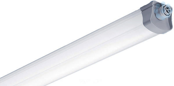LED Profilleuchte mit integriertem LED-Konverter. Geeignet für Wand- und Deckenmontage. Zugelassen für den Einsatz in Innen- und geschützten Außenbereichen. Schnellmontage mit Deckenklammer aus Edelstahl (Leuchte einclipsbar), ausrichten der Leuchte durch den variablen Verschiebebereich ±100mm. Profil aus schlagfestem Polycarbonat (PC) in lichtsteuernder opalisierter Optik. Endkappen aus schlagfestem Polycarbonat (PC) grau. Deckenaufhellung mit hohem Indirektanteil von 16 %. Geräteträger aus Stahlblech verzinkt in weiß. Leuchte mit begrenzter Oberflächentemperatur, für Bereiche, in denen leitfähige Stäube zu erwarten sind.