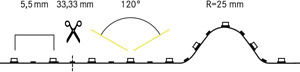 LED-Flexplatine Food, 5 m, 14,4 W / m, IP00, LED-Weißlicht, 3.850K, CRI 75 LED-Flexplatine zur dekorativen, technischen, sowie effizienten Beleuchtung von Lichtvouten, Linearanwendungen und Hinterleuchtungen, Grund- bzw. Allgemeinbeleuchtung von Räumen, architektonische Anwendungen und für Bereiche, in denen eine hohe Ausleuchtung gewünscht ist, wie z.B. indirekte oder direkte Beleuchtungen, Lichtdecken, Gastronomiebeleuchtungen und vielem mehr.Länge: 33.33 mm Lampenleistung je Meter: 14.4 W/m, Lichtstrom je Meter: 1350.0 lm/m, Schutzart raumseitig: IP00, Schutzklasse: III, Spannung: 24V DC, Abstrahlwinkel: 120.0 °, 180 LEDs pro Meter, Chip-Abstand (Short Pitch) : 5,55mm. Zur Individuellen Anwendung kann die LED-Flexplatine alle 33,33 mm eingekürzt werden. Die maximale Systemlänge von 5.000mm darf mit einer Einspeisung nicht überschritten werden.