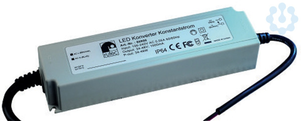 rutec LED Konverter Kontstantstrom für die Innenanwendung IP64 Eingebaute aktive Blindstromkompensation (Aktiv PFC) Schutzklasse II, CE, RoHS, REACH Schutz gegen Kurzschluss, Überlast und Überspannung Primär- und Sekundärseitig 1 Zu- bzw. Ableitung Gehäuse: Kunststoff Eingangsspannung: 100-240V AC Ausgangsstrom: 1000mA Leistung: 34-48 Watt