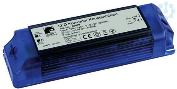rutec LED Konverter Kontstantstrom für die Innenanwendung IP20 Eingebaute Blindstromkompensation (Aktiv PFC) Schutzklasse II, CE, RoHS, TÜV Rheinland Schutz gegen Kurzschluss, Überlast und Überspannung Schraubanschlüsse Gehäuse: Kunststoff Eingangsspannung: 100-240V AC Ausgangsstrom: 700mA Leistung: 3-18 Watt