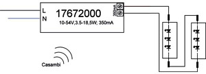 LED-Konverter 350mA, Casambi dimmbar. Dieses Betriebsgerät erfüllt die Anforderungen für Sicherheitsbeleuchtungsanlagen nach DIN EN 50172 VDE 0108-100:2005-01. Dieser Konverter ist durch Sicherungseinrichtungen gegen Überspannung und Kurzschluss sowie thermische und elektrische Überlastung geschützt. Die Eingangs- und die Ausgangsklemme ist für Leitungen mit einem Querschnitt von bis zu 1,5 mm² geeignet. Material: Kunststoff, Schutzart: nach DIN EN 60529: IP20, Schutzklasse: (EN 61140) II, Spannung: 230V AC 50Hz, Leistung: 18W, Dimmbar: Ja, Art der Dimmung: Casambi.