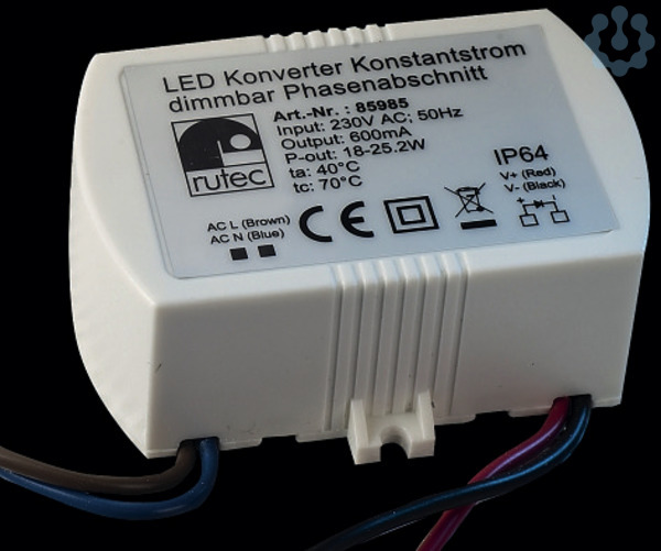 rutec LED Konverter Kontstantstrom-dimmbar für die Innenanwendung IP64 Eingebaute aktive Blindstromkompensation (Aktiv PFC) Schutzklasse II, CE, RoHS Schutz gegen Kurzschluss, Überlast und Überspannung Primär- und Sekundärseitig 1 Zu- bzw. Ableitung Dimmbar mit Phasen Abschnittsdimmern Gehäuse: Kunststoff Eingangsspannung: 230V AC Ausgangsstrom: 600mA Leistung: 18-25,2 Watt
