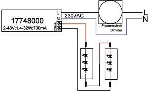 LED-Konverter 700 mA, Phasenabschnitt dimmbar. Dieses Betriebsgerät erfüllt die Anforderungen für Sicherheitsbeleuchtungsanlagen nach DIN EN 50172 VDE 0108-100:2005-01. Dieser Konverter ist durch Sicherungseinrichtungen gegen Überspannung und Kurzschluss sowie thermische und elektrische Überlastung geschützt. Die Eingangs- und die Ausgangsklemme ist für Leitungen mit einem Querschnitt von bis zu 1,5 mm² geeignet. . Material: Kunststoff, Schutzart: nach DIN EN 60529: IP20, Schutzklasse: (EN 61140) II, Spannung: 230V AC 50Hz, Leistung: 32W, Art der Dimmung: Phasenabschnitt.