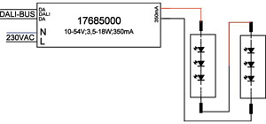 LED-Konverter 350 mA, DALI dimmbar (digital). Dieser Konverter ist durch Sicherungseinrichtungen gegen Überspannung und Kurzschluss sowie thermische und elektrische Überlastung geschützt. Die Eingangs- und die Ausgangsklemme ist für Leitungen mit einem Querschnitt von 0,75-1,5 mm² geeignet. Material: Kunststoff, Schutzart: nach DIN EN 60529: IP20, Schutzklasse: (EN 61140) II, Spannung: 230V AC 50Hz , Leistung: 18W, Art der Dimmung: DALI-2.