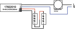 LED-Konverter 500 mA, Phasenabschnitt dimmbar. Dieses Betriebsgerät erfüllt die Anforderungen für Sicherheitsbeleuchtungsanlagen nach DIN EN 50172 VDE 0108-100:2005-01. Dieser Konverter ist durch Sicherungseinrichtungen gegen Überspannung und Kurzschluss sowie thermische und elektrische Überlastung geschützt. Die Eingangs- und die Ausgangsklemme ist für Leitungen mit einem Querschnitt von bis zu 2,5 mm² geeignet. . Material: Kunststoff, Schutzart: nach DIN EN 60529: IP20, Schutzklasse: (EN 61140) II, Spannung: 230V AC 50Hz, Leistung: 20W, Art der Dimmung: Phasenabschnitt.