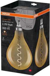 LED-Lampen, Vintage-Edition. Produkteigenschaften: LED-Lampen für Netzspannung. Lampe aus Glas. Lebensdauer: bis zu 15.000 h. Ausstrahlungswinkel: bis zu 360°. Gute Lichtqualität; Farbwiedergabeindex Ra: ≥ 80; konstanter Farbort. Produktvorteile: Sehr geringer Energieverbrauch. Sofort 100 % Licht, keine Aufwärmzeit. Einfacher Austausch von Standardglühlampen. Lampen mit innovativer LED-"Filament"-Technologie. Anwendungsgebiete: Ideal für dekorative Einbauten. Anwendungen im Haushalt. Allgemeinbeleuchtung. Einsatz im Außenbereich nur in geeigneten Außenleuchten.