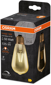 Dimmbare LED-Lampen, Vintage-Edition. Produkteigenschaften: LED-Lampen für Netzspannung. Lampe aus Glas. Lebensdauer: bis zu 15.000 h. Ausstrahlungswinkel: bis zu 360°. Dimmbar. Gute Lichtqualität; Farbwiedergabeindex Ra: ≥ 80; konstanter Farbort. Produktvorteile: Sehr geringer Energieverbrauch. Sofort 100 % Licht, keine Aufwärmzeit. Einfacher Austausch von Standardglühlampen. Lampen mit innovativer LED-"Filament"-Technologie. Anwendungsgebiete: Ideal für dekorative Einbauten. Anwendungen im Haushalt. Allgemeinbeleuchtung. Einsatz im Außenbereich nur in geeigneten Außenleuchten.