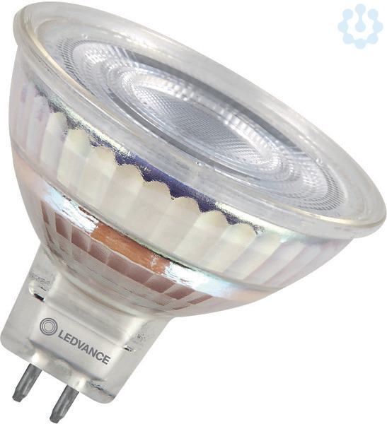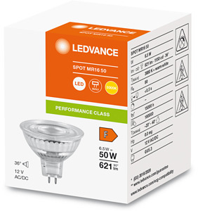 Niedervolt-LED-Reflektorlampen MR16 mit Retrofit-Stecksockel. Produkteigenschaften: LED-Alternative zu Niedervolthalogenlampen. Hohe Farbkonsistenz: ≤ 6 SDCM (Schwellwerteinheit). Nicht dimmbar. Sockel: GU5.3. Lampe aus Glas. Gute Lichtqualität; Farbwiedergabeindex Ra: ≥ 80. Lebensdauer: bis zu 15.000 h. Produktvorteile: Einfacher, schneller und sicherer Lampenaustausch ohne Umverdrahtung. Design, Abmessungen, Lichtstrom vergleichbar mit einer Glüh- oder Halogenlampe. Geringer Wartungsaufwand durch lange Lebensdauer. Keine UV- und IR-nahen Anteile im Lichtstrahl. Sofort 100 % Licht, keine Aufwärmzeit. Anwendungsgebiete: Verkaufs- und Ausstellungsräume. Anwendungen im Haushalt. Anwendung im Gewerbe. Akzentbeleuchtung. Einsatz im Außenbereich nur in geeigneten Außenleuchten. Technische Ausstattung: Bestückt mit High-Power-LED.