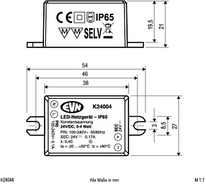 Das LED-Netzgerät lässt sich auf Grund der kleinen Bauform perfekt in Schalterdosen, oder aber auch bei schwierigen Platzverhältnissen verbauen. Die Anschlussleitungen haben eine Länge von 17cm primärseitig und 17cm sekundärseitig. Technische Daten: Versorgungsspannung: 100-240V/AC und 180-250V/DC, ta: -20°C - 50°C, tc: 80°C, Powerfaktor 0,40.