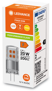 Dimmbare 12 V-Niedervolt-LED-Lampen mit Retrofit-Stecksockel. Produkteigenschaften: Dimmbar (an vielen handelsüblichen Dimmern, siehe auch www.ledvance.de/dim). Kompatibel mit vielen handelsüblichen elektronischen Vorschaltgeräten (siehe auch Kompatibilitätsliste). LED-Alternative zu Niedervolthalogenlampen. Sockel: G4, GY6.35. Produktvorteile: Variabler Einsatz an Gleich- und Wechselspannung möglich. Gute Rundum-Lichtausstrahlung. Ideal für den dekorativen und frei brennenden Einsatz. Sehr lange Lebensdauer von bis zu 25.000 h. Vier Jahre Garantie. Anwendungsgebiete: Dekorative Anwendungen. Für stimmungsvolle Lichtakzente in Wohnräumen und Partykellern. Einsatz im Außenbereich nur in geeigneten Außenleuchten.