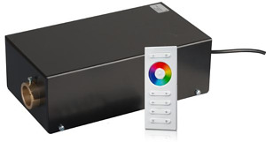 LED-RGB+W-Faser-Projektor. Bestehend aus: 1 x LED-RGB+W-Projektor Leistung: 8 W, LED-RGB+W (W = 2850 K), Abmessungen: L 270 x B 155 x H 100 mm, Gehäusematerial: Stahl, Gehäusefarbe: schwarz - inkl. Funk-Fernbedienung - Inkl. 1.500 mm Anschlussleitung mit Schutzkontaktstecker - Inkl. Netzgerät zum Anschluss an 230 V-Netzspannung - ohne Lüfter (somit keine Geräuschentwicklung) LED-Farbsteuerung mit Funk-Fernbedienung. Funkfrequenz 869,5 MHz, Sendeleistung (Ps) < 0 dBm, Reichweite (Sichtverbindung): ca. 5 m. Funktionsumfang der Fernbedienung: - Ein / Aus - Weißlicht-Auswahltaste (ww / nw / w) - RGB-Farbwechsel über Touchwheel - Dimmtasten für rot / grün / blau - Dimmung der eingestellten Lichtfarbe - Insgesamt 10 unterschiedliche Farbprogramm-Auswahlmöglichkeiten Schutzart: nach DIN EN 60529: IP20, Schutzklasse: (EN 61140) I, Spannung: 230 V AC 50 Hz Schutzart raumseitig: nach DIN EN 60529: IP20, Schutzklasse: (EN 61140) I, Spannung: 230V AC 50Hz, Leistung: 8W, Lichtfarbe: RGBW, mit Betriebsgerät, Art der Dimmung: Funksteuerung.