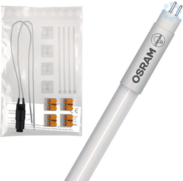 T5 LED-Röhren inklusive Umrüstkit für einflammige Leuchten. Produkteigenschaften: Enthält 10 SubstiTUBE T5 220-240V AC LED-Röhren und 10 Umrüstkits für einflammige Leuchten. Umrüstkit enthält alle für die Umverdrahtung benötigten Materialen. Detaillierte Schritt-für-Schritt-Anleitung für garantierte TÜV-Zertifizierung verfügbar. LED-Ersatz für Leuchtstofflampen mit G5-Sockel an Netzspannung. Lampenröhre aus Glas mit Splitterschutz für Anwendungen z.B. in der Lebensmittelindustrie. Hohe Farbkonsistenz: ≤ 5 SDCM (Schwellwerteinheit). Lebensdauer: bis zu 50.000 h. Flimmerarm nach EU 2019/2020. Schutzart: IP20. Produktvorteile: Umbau benötigt nur ca. 5 Minuten pro Leuchte. Keine EVG-Kompatibilitätsprobleme. Keine Wartung des EVGs mehr notwendig. Kein Durchhängen dank Glastechnik. Splitterschutz dank spezieller PET-Beschichtung. Hoher Lichtstrom für anspruchsvolle Beleuchtungsaufgaben. Anwendungsgebiete: Büros, öffentliche Einrichtungen. Supermärkte und Warenhäuser. Industrie. Allgemeinbeleuchtung in Umgebungstemperaturen von -20…+45 °C.