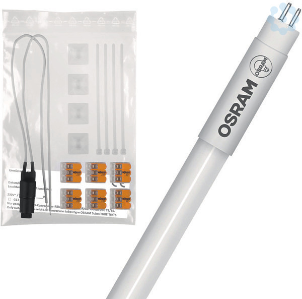 T5 LED-Röhren inklusive Umrüstkit für zweiflammige Leuchten. Produkteigenschaften: Enthält 10 SubstiTUBE T5 220-240V AC LED-Röhren und 10 Umrüstkits für zweiflammige Leuchten. Umrüstkit enthält alle für die Umverdrahtung benötigten Materialen. Detaillierte Schritt-für-Schritt-Anleitung für garantierte TÜV-Zertifizierung verfügbar. LED-Ersatz für Leuchtstofflampen mit G5-Sockel an Netzspannung. Lampenröhre aus Glas mit Splitterschutz für Anwendungen z.B. in der Lebensmittelindustrie. Hohe Farbkonsistenz: ≤ 5 SDCM (Schwellwerteinheit). Lebensdauer: bis zu 50.000 h. Flimmerarm nach EU 2019/2020. Schutzart: IP20. Produktvorteile: Umbau benötigt nur ca. 5 Minuten pro Leuchte. Keine EVG-Kompatibilitätsprobleme. Keine Wartung des EVGs mehr notwendig. Kein Durchhängen dank Glastechnik. Splitterschutz dank spezieller PET-Beschichtung. Hoher Lichtstrom für anspruchsvolle Beleuchtungsaufgaben. Anwendungsgebiete: Bestellbeispiel zur Umrüstung 10 zweiflammiger Leuchten: ein Sortiment bestehend aus Umrüstkit + LED-Röhren (jeweils 10 Stck) plus eine volle Versandeinheit LED-Röhren (10 Stck). Büros, öffentliche Einrichtungen. Supermärkte und Warenhäuser. Industrie. Allgemeinbeleuchtung in Umgebungstemperaturen von -20…+45 °C.
