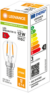 LED-Speziallampen für Kühlschränke. Produkteigenschaften: LED-Alternative zu konventionellen Hochvoltlampen. Gute Lichtqualität; Farbwiedergabeindex Ra: ≥ 80; konstanter Farbort. Produktvorteile: Extrem kleine Bauform. Gute Rundum-Lichtausstrahlung. Ideal für den dekorativen und frei brennenden Einsatz. Lange Lebensdauer von bis zu 15.000 h. Vier Jahre Garantie. Anwendungsgebiete: Kleine Designerleuchten. Haushaltskühlschränke. Nähmaschinen. Einsatz im Außenbereich nur in geeigneten Außenleuchten.