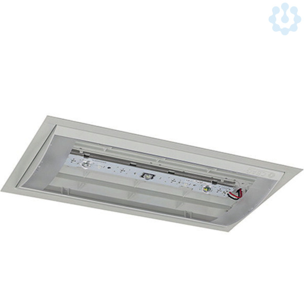 Sicherheitsleuchte gem. DIN EN 60598-1, DIN EN 60598-2-22 und DIN EN 1838. Leuchte mit abgerundeter Lichtaustrittsfläche, Leuchtengehäuse aus 850°C glühdrahtbeständigem, halogenfreiem Polycarbonat. Inklusive Einbaurahmen aus lackiertem Stahlblech zum Einbau in Hohldecken (Deckenstärke 5-20 mm). Lichtlenkung mittels spezieller LED-Optikanordnung für besonders effiziente Fluchtwegeausleuchtung mit mind. 1lx nach DIN EN 1838 für Lichtpunkthöhen bis 7 m. Maximaler Abstand Leuchte zu Leuchte:> 16 m ab 3 m Lichtpunkthöhe und > 21 m ab 5 m Lichtpunkthöhe (Berechnungsgrundlage: mind. 1lx auf Fluchtwegmitte Wartungsfaktor = 0,8). Hohe Lebensdauer > 50000 h durch optimierte LED-Betriebsbedingungen. Spezieller LED-Konverter mit integriertem Überwachungsbaustein für Einzelleuchtenüberwachung mit 20-stelligen Adressschaltern. Mischbetrieb der Schaltungsarten (Bereitschaftslicht, Dauerlicht oder geschaltetes Dauerlicht) innerhalb eines Stromkreises ohne zusätzliche Daten- oder Schaltleitung zu den Leuchten in Verbindung mit geeigneten Gruppen- oder Zentralbatterieanlagen mit STAR-Technik möglich. Zulässiger Temperaturbereich: -20°C bis + 40°C. Montageart: Einbau Leuchtmittel: LED Lampenleistung: 3 W Schaltung: sonstige Werkstoff des Gehäuses: Kunststoff Gehäusefarbe: grau Werkstoff der Abdeckung: Kunststoff transparent Art der Kennzeichnung: nicht zutreffend Überwachungseinrichtung: Überwachungsbaustein (zentral versorgtes System) Ballwurfsicher: Nein Schaltungsart: Dauerschaltung/Bereitschaftsschaltung Mit Fernschalteranschluss (VDE 0100-718, VDE 0108-100): Ja Einspeisung: zentral (Zentralbatterie) Nennspannung: 220 - 240 V Schutzklasse: II Schutzart (IP): IP41 Mit Leuchtmittel: Ja Länge: 379 mm Breite: 236 mm Höhe/Tiefe: 65 mm Einbaulänge: 350 mm Einbaubreite: 210 mm Einbautiefe: 75 mm Lichtstrom bei Notbetrieb: 100 %
