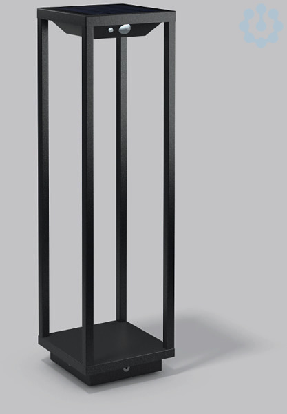 Dekorative Gartenleuchte im quadratischen Querschnitt. Gehäuse Aluminium-Druckguss pulverbeschichtet. Lichtaustrittsfenster Kunststoff (Polycarbonat) klar. Mit Kunststoff-Erdspieß. Mit integriertem Bewegungsmelder (PIR) und Dämmerungsschalter. Solarmodul für LED mit Lithium-Akku. Aufladezeit: min. 6-8 Stunden bei Tageslicht (je nach Aufstellungsort, Sonneneinstrahlung und Jahreszeit). Betriebsdauer: max. 2,5-3 Stunden (100% Licht), max. 20-25 Stunden (10% Licht bei Dämmerung) bzw. max. 12-15 Stunden (mit wechselnder Lichtleistung, beim Erkennen einer Bewegung wird das Licht für 45 Sekunden auf 100% hochgefahren, danach auf 10% runtergedimmt).