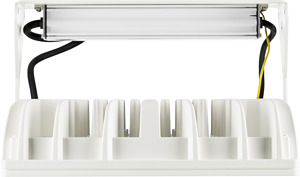LED Strahler mit Abdeckscheibe aus Einscheibensicherheitsglas (ESG), Gehäuse aus Aluminiumdruckguss, weiß beschichtet, Konverter am Gehäuse montiert. Elektrischer Anschluss durch Schnell-Steck-System, kurze, alterungsbeständige Dichtungen aus Silikon, Zweipunkt-Befestigung durch Seilpendel (2.000 mm) mit montagefreundlicher, werkzeugloser Schnelljustierung, Pendelmontage, Wand- und Decken-Befestigungsbügel als Zubehör erhältlich.